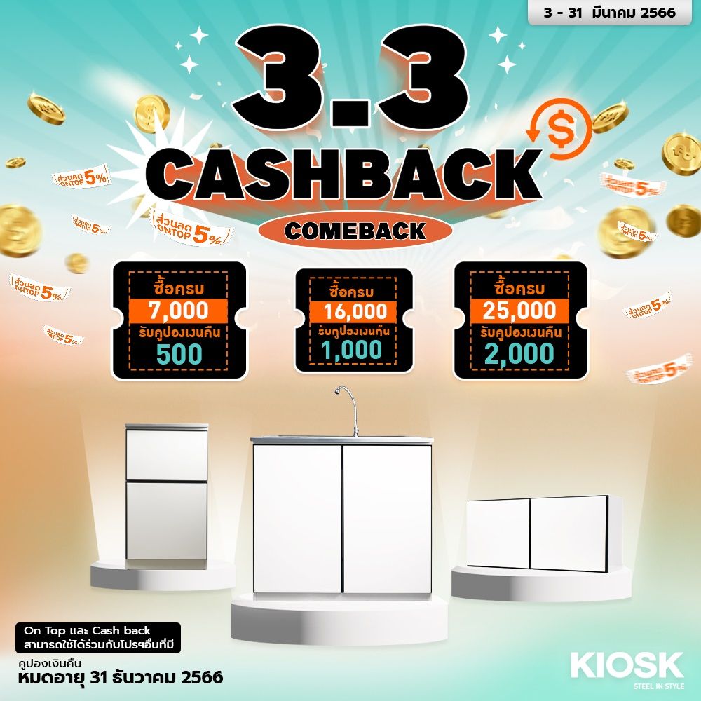 Cash Back จะได้รับเมื่อทำการชำระเงินและจัดส่งครบถ้วนแล้ว และสามารถนำมาเป็นส่วนลดผ่านการช็อปเองบน web หรือถ่ายรูปมายังผ่านช่องทาง Line หรือ FB หรือ ร้าน KIOSK ทั้ง3สาขา